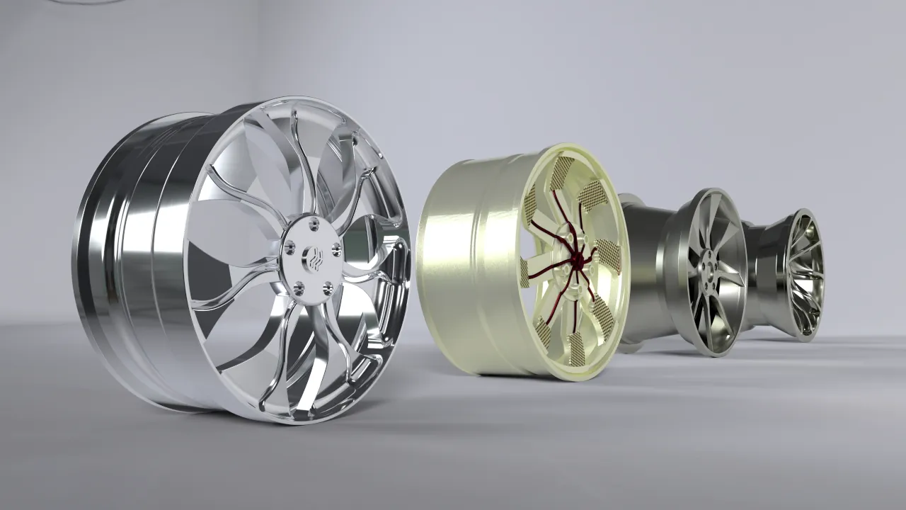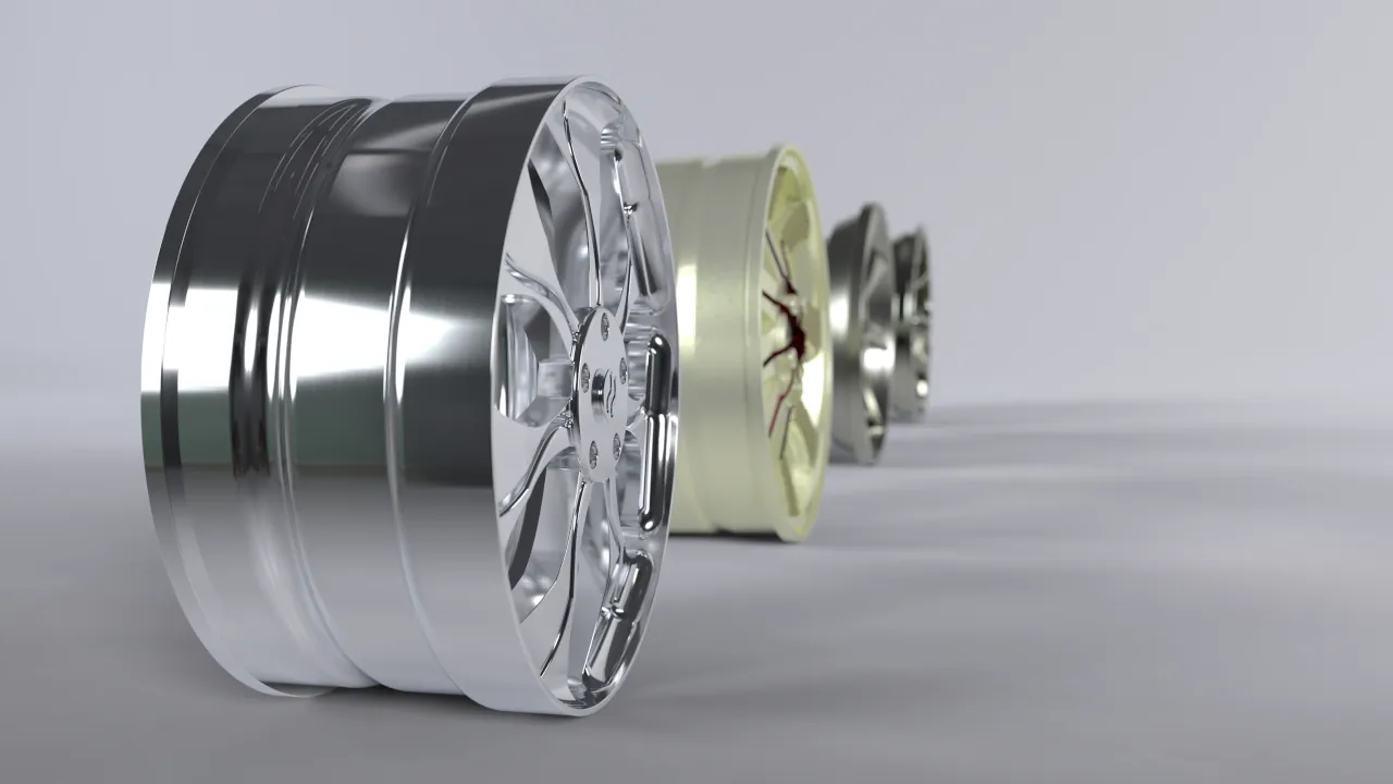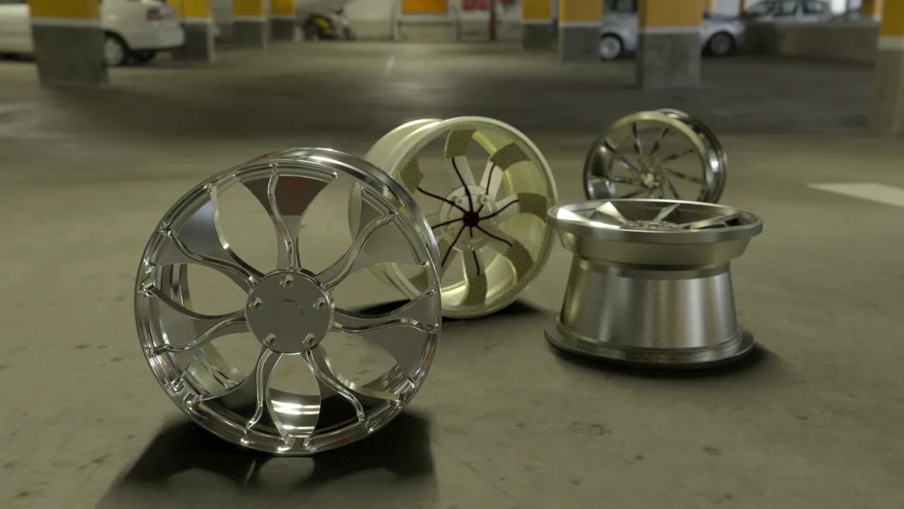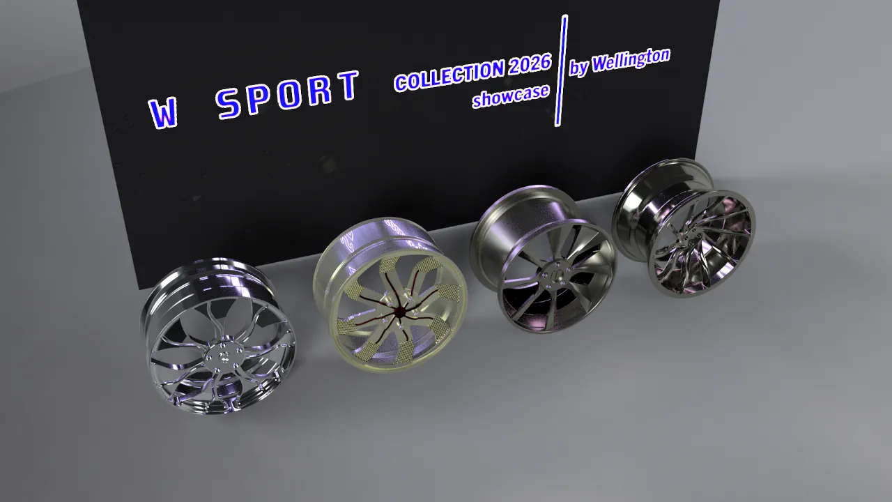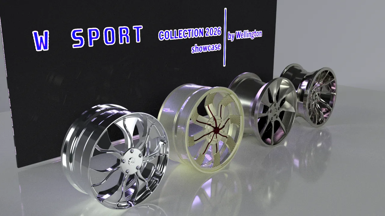 Conjunto de rodas esportivas, projetadas em variados softwares (Autodesk AutoCAD, Autodesk Inventor Professional, Autodesk Alias AutoStudio), e renderizado no Autodesk VRED. Algumas imagens foram compostas por fundos HDRI e outras com fotos.